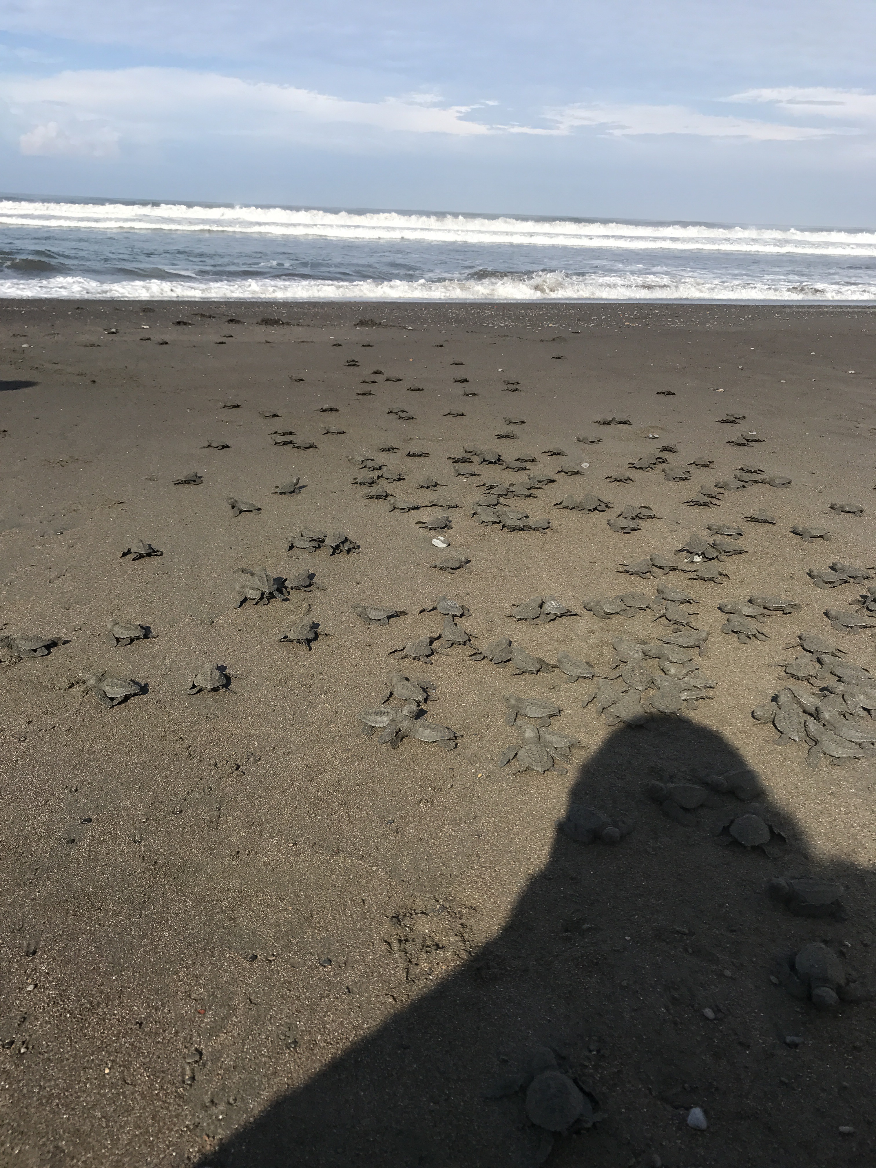 Una de las cosas por la cual estoy sumamente agradecida, es que nos tocó vivir y ayudar durante una arribada. Para todos los que no saben que es una arribada, no se preocupen, yo tampoco sabía antes de este programa. Una arribada es un fenómeno que sucede una vez al mes cuando la luna está en cuarto menguante. Los científicos aún no han podido explicar porque sucede pero màs de 500 tortugas llegan a la playa a poner huevos. La más grande ha sido de medio millón de tortugas.